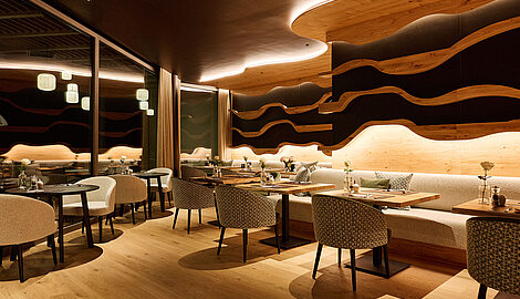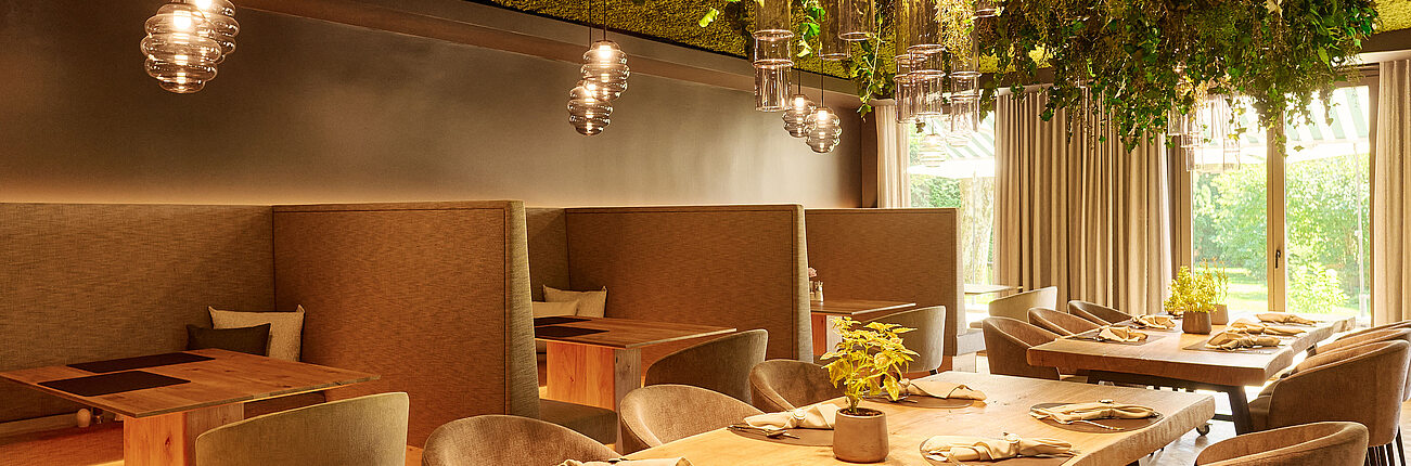 Naturmaterialien, eine begrünte Raumdecke, viel Holz, handverlesene Stoffe und eine klare, ruhige Ästhetik prägen unser neu gestaltetes Restaurant. Die großen Fenster öffnen den Blick in die Wiesen und Wälder, während innen wohltuende Farben und sanfte Formen den Raum in Geborgenheit hüllen. Hier servieren wir unsere Naturküche in all ihren Facetten – vom duftenden Frühstück mit hausgemachten Spezialitäten über kreative Mittagsgerichte bis hin zu liebevoll komponierten Abendmenüs mit saisonalem Bezug.