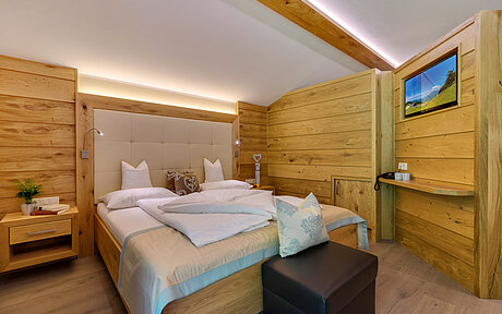 Natürliche Materialien, edle Stoffe repräsentieren ein Stück Heimat und die regionale Verbundenheit. Unsere modernen Suiten sind besondere Rückzugsorte, mit viel Liebe zum Detail gestaltet.